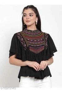 Trendy Feminine Women Tops & Tunics Fabric: Rayon,Rayon Slub Sleeve Length: Short Sleeves Pattern: Embroidered Multipack: 1 Sizes: XS, S (Bust Size: 36 in, Length Size: 24 in) M (Bust Size: 38 in, Length Size: 24 in) L (Bust Size: 40 in, Length Size: 24 in) XL (Bust Size: 42 in, Length Size: 24 in) Easy Returns Available In Case Of Any Issue