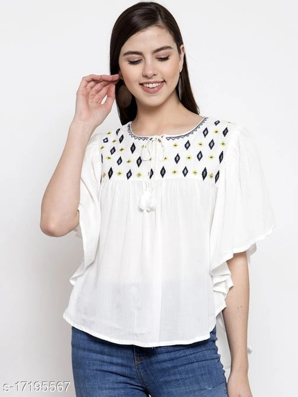 Classy Fashionista Women Tops & Tunics Fabric: Viscose Sleeve Length: Three-Quarter Sleeves Pattern: Embroidered Multipack: 1 Sizes: S (Bust Size: 38 in, Length Size: 21 in) M (Bust Size: 39 in, Length Size: 22 in) L (Bust Size: 41 in, Length Size: 23 in) XL (Bust Size: 43 in, Length Size: 24 in) XXL (Bust Size: 46 in, Length Size: 24 in) Easy Returns Available In Case Of Any Issue