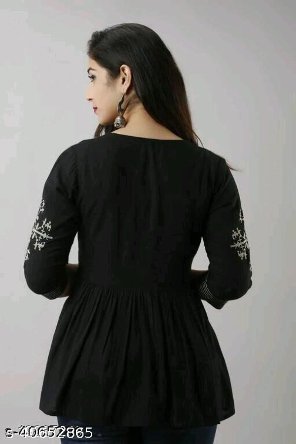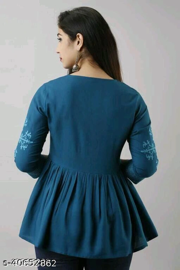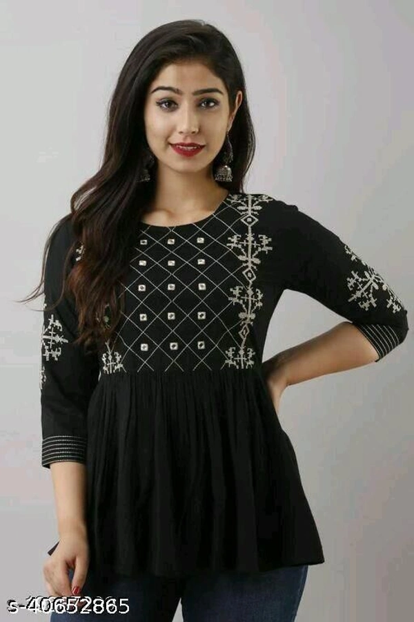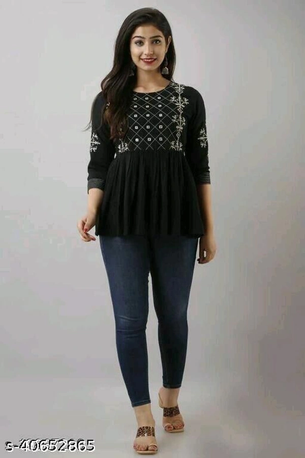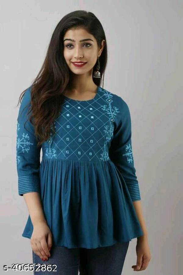 Embroidered 3/4 sleeves tunic/top for women Fabric: Rayon Sleeve Length: Three-Quarter Sleeves Pattern: Embroidered Multipack: 1 Sizes: XL,S, L, M, XXL Embroidered Tunic/Top For women with 3/4 sleeves Country of Origin: India
