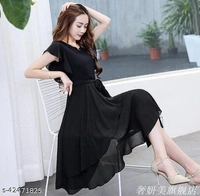 Women Solid Black Knee length Georgette Dress