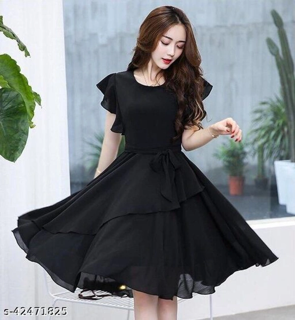 Women Solid Black Knee length Georgette Dress Fabric: Georgette Sleeve Length: Short Sleeves Pattern: Solid Multipack: 1 Sizes: S (Bust Size: 36 in) XL (Bust Size: 42 in) L (Bust Size: 40 in) M (Bust Size: 38 in) Women Trendy Georgette Dresses Country of Origin: India
