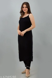 Attractive Women's Black Kurti Pant Set Of Rayon Kurta Fabric: Rayon Bottomwear Fabric: Rayon Fabric: Rayon Sleeve Length: Sleeveless Set Type: Kurta With Bottomwear Bottom Type: Pants Pattern: Solid Multipack: Single Sizes: S (Bust Size: 36 in) XL (Bust Size: 42 in) L (Bust Size: 40 in) M (Bust Size: 38 in) XXL (Bust Size: 44 in) XS (Bust Size: 34 in) Get your hands on this trendy yet comfortable KURTI & PANT SET from MISTREE made keeping your comfort in mind. just wear it and turn on the charming side of you. Country of Origin: India